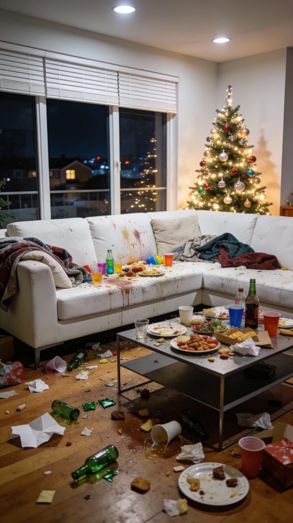 Comencé a limpiar. Mi esposo me ayudó. Limpiamos hasta las tres de la mañana. Sacábamos botellas, lavábamos platos, cambiábamos la ropa de cama, limpiábamos manchas del sofá. En una esquina de la sala encontramos colillas en el suelo — la alfombra quemada.
